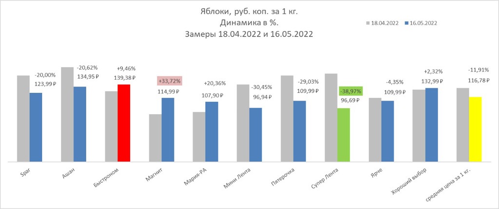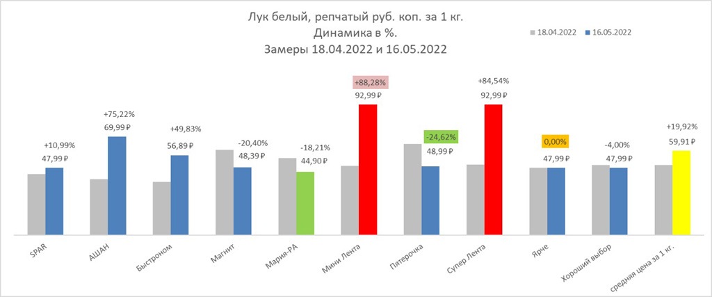 Цены фиксируют в сетях Spar, «Ашан», «Быстроном», «Магнит», «Мария-Ра», «Мини Лента», «Пятерочка», «Супер Лента», «Ярче» и «Хороший выбор». Принцип выбора товара — самая низкая стоимость. Сравнивать будем цены за 18 апреля и за 16 мая — спустя четыре недели.