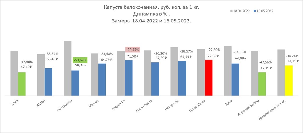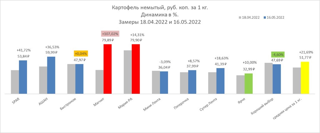 В апреле мы рассказывали о стоимости наиболее популярных овощей в 20 магазинах в различных районах города. Оцениваем динамику в тех же торговых точках.
