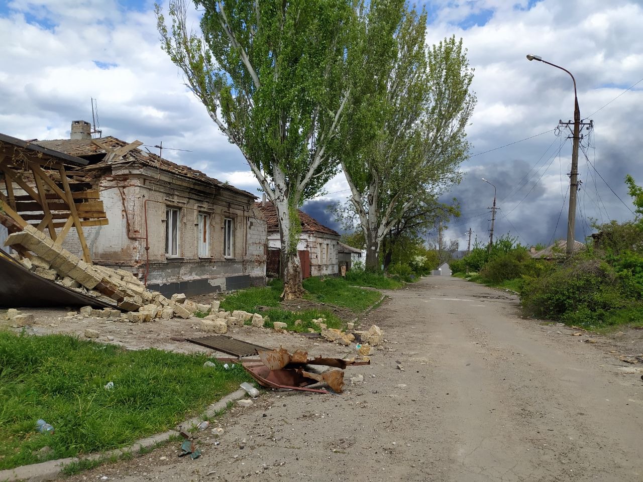 В конце улицы с разбитыми частными домами виден черный дым из «Азовстали». 12 мая 2022 года. Виталий Лейбин