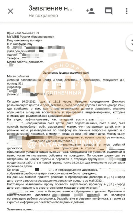 16 мая родители воспитанников частного детсада «Город детства» обратились с заявлением в полицию (оно было также опубликовано в местном паблике).