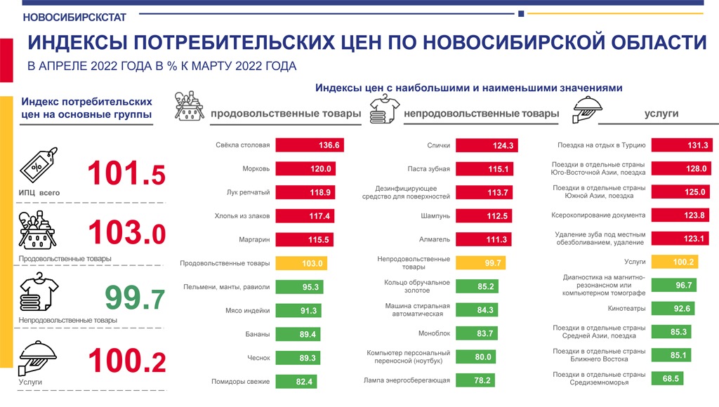 Потребительские цены в Новосибирской области в январе-апреле 2022 года выросли на 11,7%. В апреле инфляция составила 1,48%, говорится в материалах Новосибирскстата.