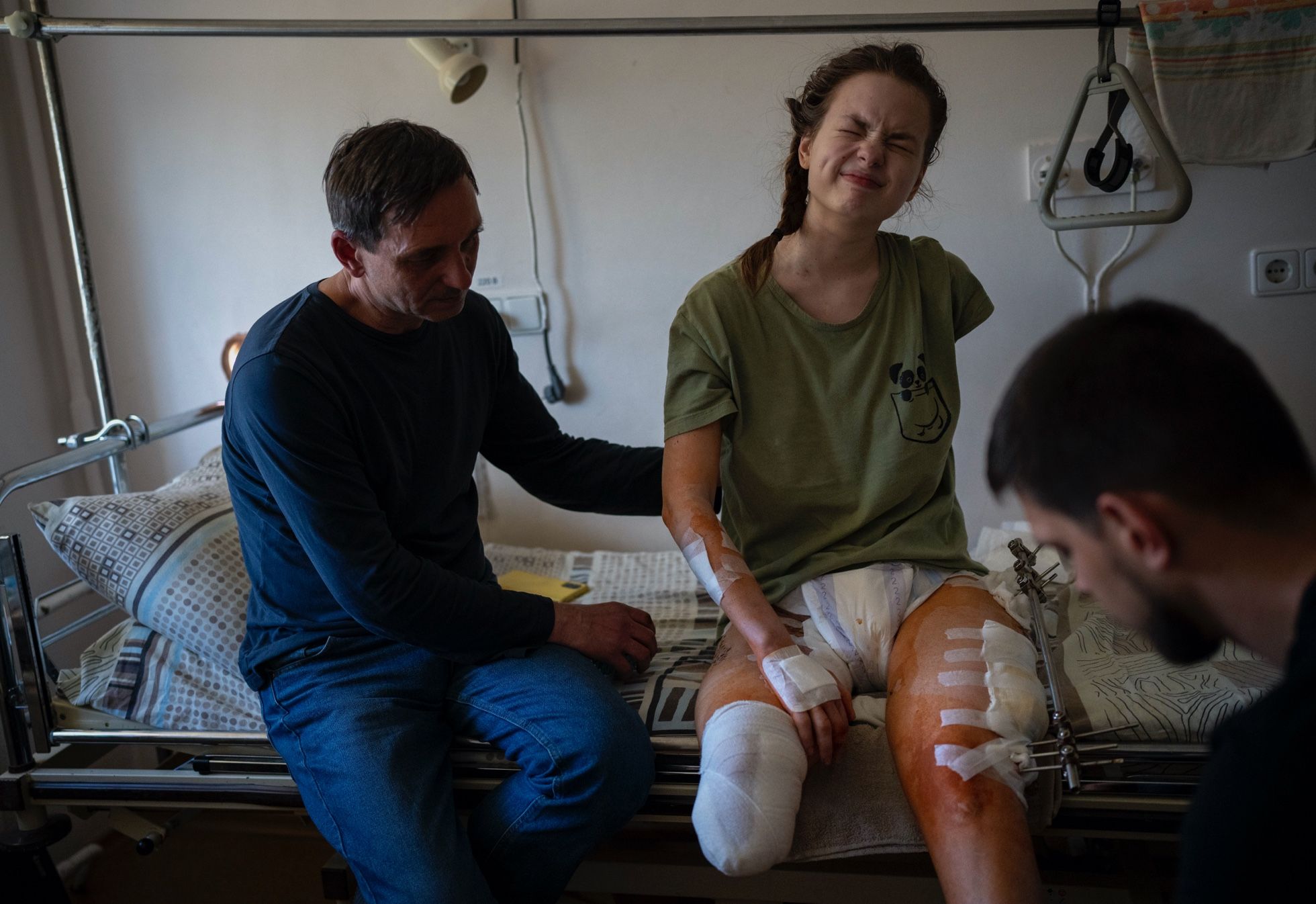 Возвращаясь, Настя услышала звуки подлетающих снарядов и побежала к убежищу. Она была у самого входа, когда взрывная волна сбила ее с ног. Настя потеряла сознание. Когда она очнулась, ее брат был рядом и твердил ей, что все будет хорошо. Настю госпитализировали, врачам не удалось спасти ее правую ногу — ее ампутировали выше колена.