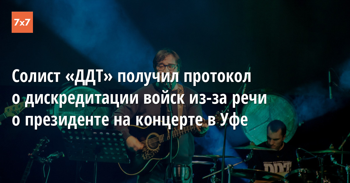 Музыкант Юрий Шевчук получил протокол о дискредитации армии за высказывание о президенте на концерте в Уфе (часть 1 статьи 20.3.3 КоАП РФ). Фронтмен группы «ДДТ» сказал, что родина — это «бабушка нищая на вокзале, продающая картошку», а не угождение президенту. Он упомянул военные действия в Чечне. После концерта к Шевчуку за кулисы пришли силовики и составили протокол.