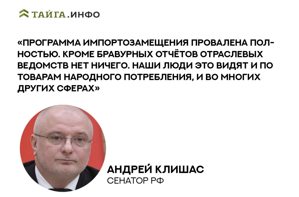 15:03 Красноярский сенатор Андрей Клишас заявил о провале импортозамещения в России.