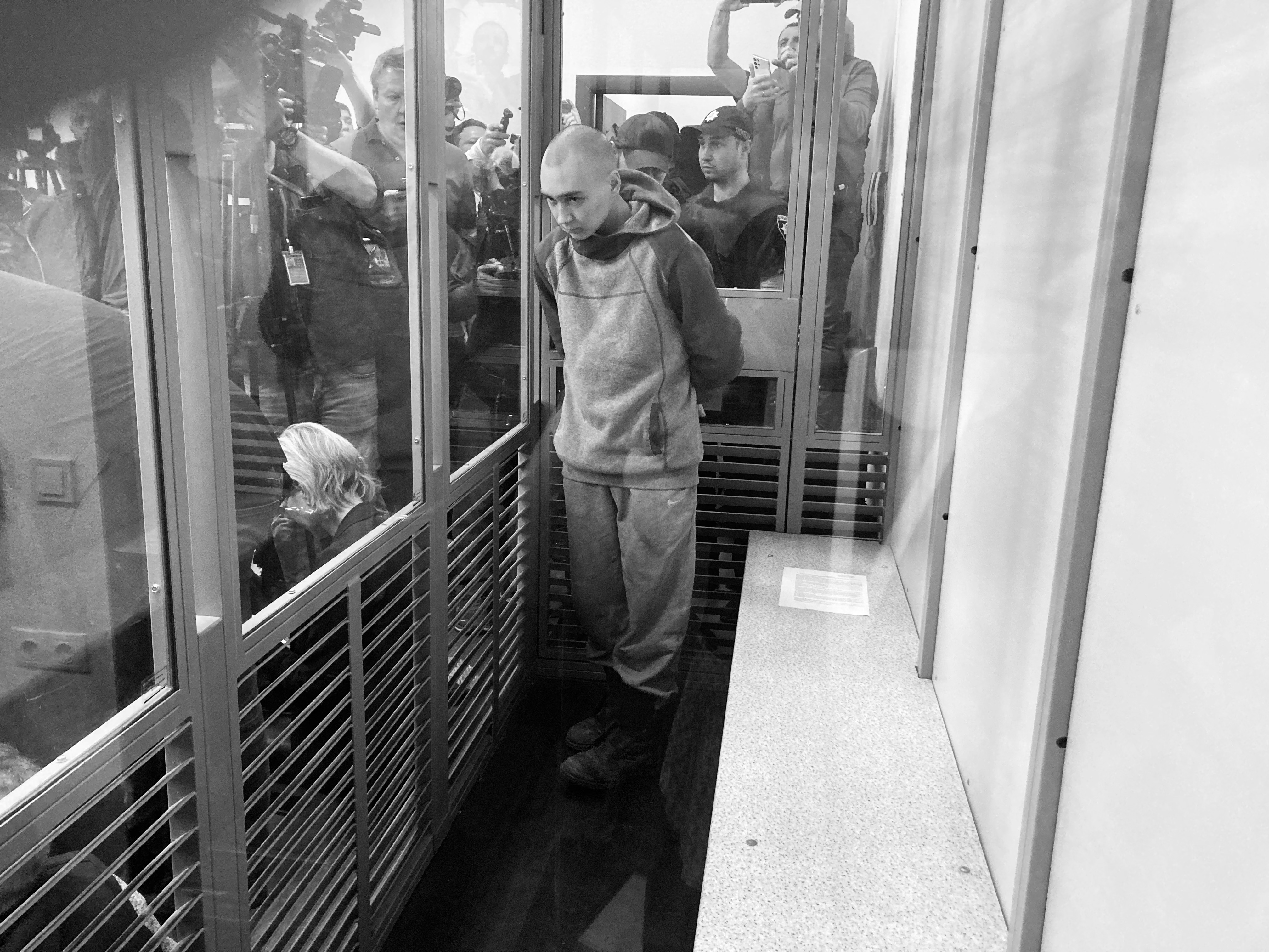Я увидела Шишимарина, когда его привели на самое первое заседание: щуплый обритый налысо паренек в серо-синем спортивном костюме и старых солдатских берцах без шнурков. Он был в наручниках, я ждала, что, как только их снимут, он начнет потирать запястья, – так обычно делают обвиняемые в российских судах, потому что наручники на них затягивают как можно туже, – но у Шишимарина с запястьями все было в порядке, он просто сел на скамью в стеклянной клетке и стал слушать переводчицу – молодую женщину православного вида в белом платочке.