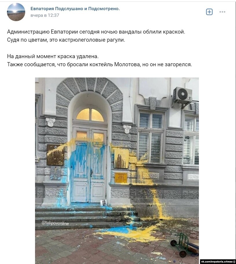 Российские силовики заявили, что около 4 часов утра 16 мая гражданин облил здание российской администрации краской и предпринял попытку поджога внутреннего помещения, метнув изготовленные им зажигательные смеси.