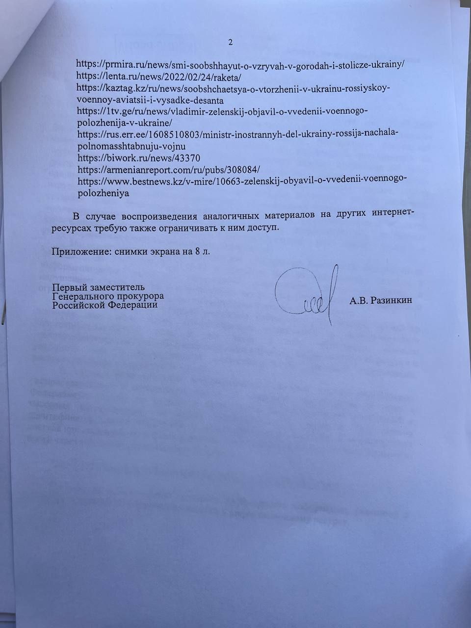 Публикации «Медузы» в этом документе не упоминаются, никаких ссылок на материалы издания в нем нет. Вместе с тем заместитель генпрокурора Анатолий Разинкин, чья подпись стоит под документом, в конце добавляет: «В случае воспроизведения аналогичных материалов на других интернет-ресурсах требую также ограничивать к ним доступ».