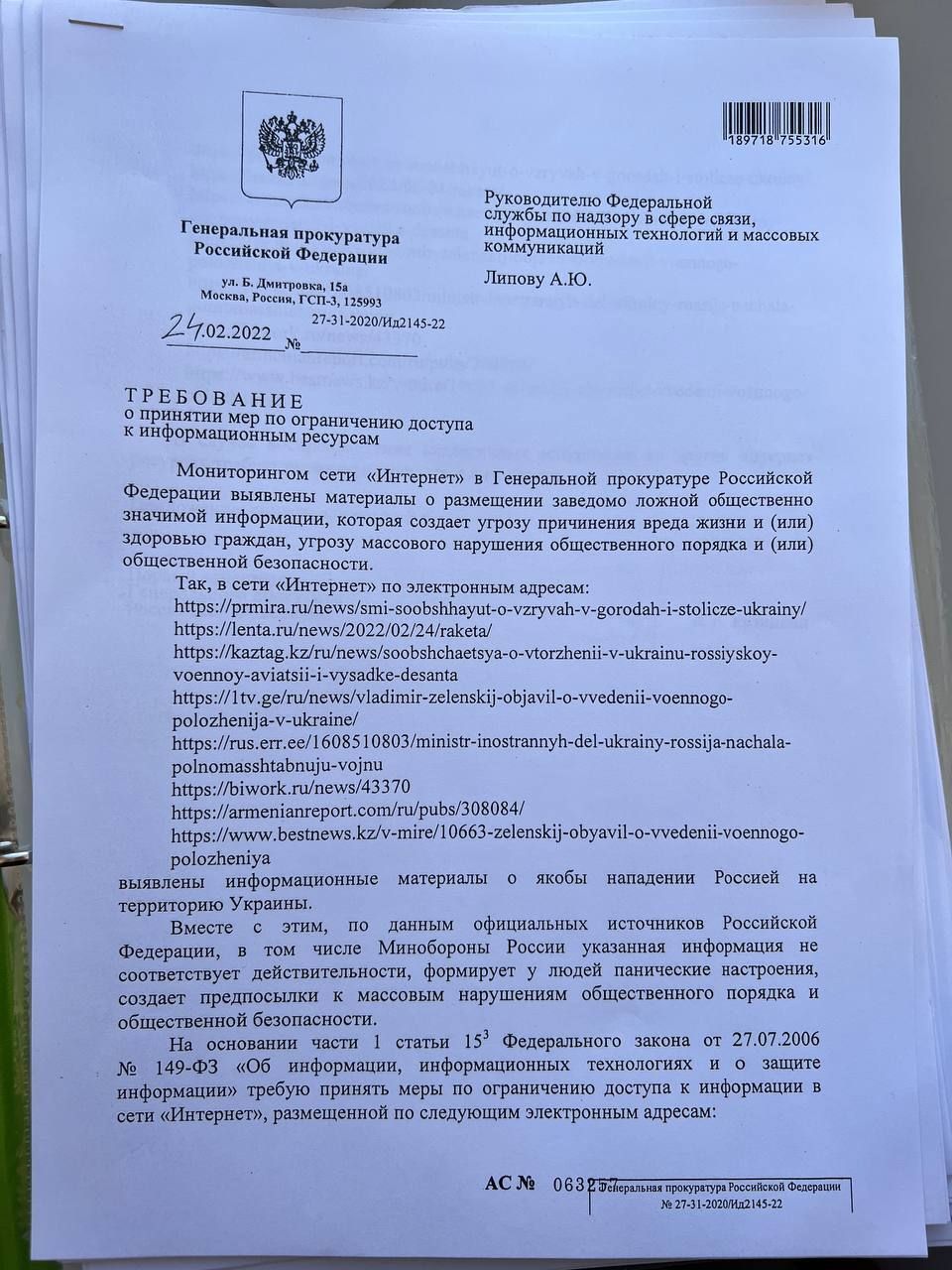 «Медузу» заблокировали в России на основании требования Генпрокуратуры об ограничении доступа к информационным ресурсам (номер 31.27.2020/Ид2145-22 от 24 февраля 2022 года). В нем перечисляются публикации восьми изданий из России, Казахстана, Грузии, Армении и Эстонии, которые содержат «не соответствующую действительности информацию», а именно — «материалы о якобы нападении Россией на территорию Украины».