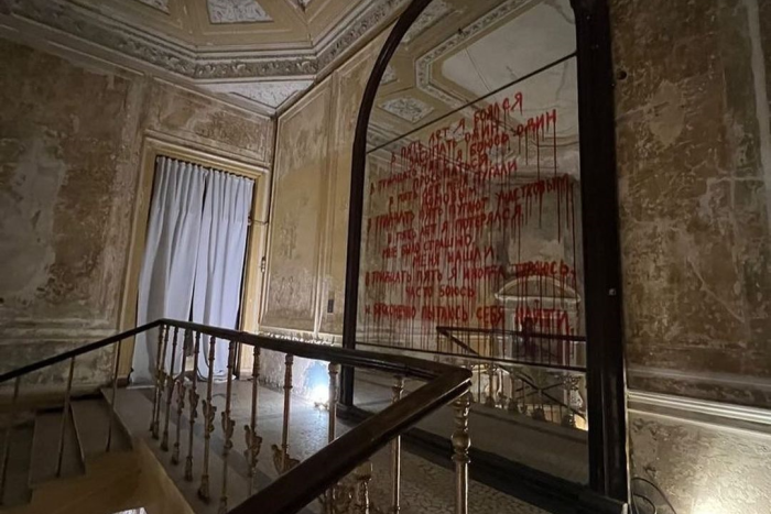 Петербургский художник Максим Има выставил свою новую работу «Монстры под кроватью» в пространстве «Третье место» на Литейном проспекте, 62. Объект представляет собой зеркало, расписанное красной краской.