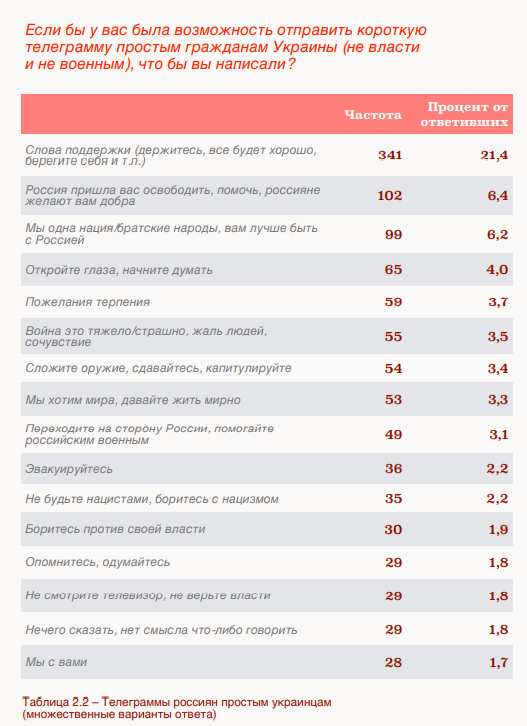 Наиболее частотные послания от россиян — слова поддержки, «Россия пришла вас освободить», «Мы — одна нация, один народ, вам лучше быть с Россией». Непосредственно о «борьбе с нацистами» практически никто не высказывается (вместе с «бандеровцами и фашистами» всего 3 %), упоминание «братства», единства народов встречается у 3 % респондентов.