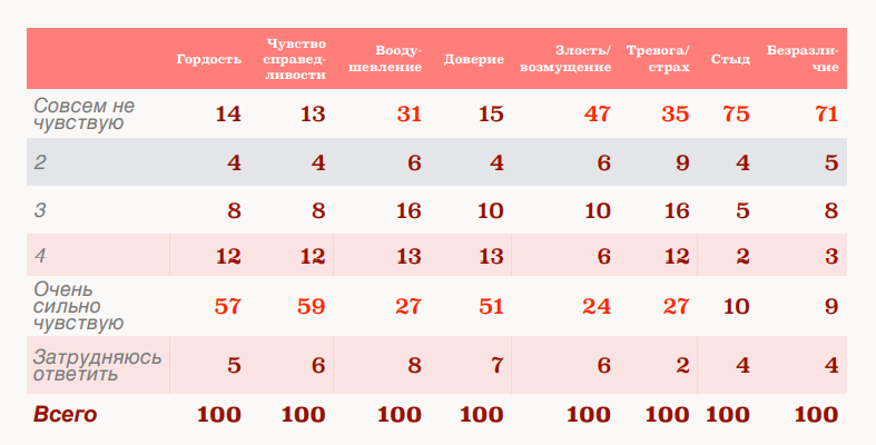 Исследователи разбили респондентов на три группы: «эмоциональные», «положительные» и «сдержанные». «Эмоциональные» — те, кто отвечал «сильно чувствую», вне зависимости от полюса эмоций. Сильнее всего эти респонденты испытывают гордость — 85 % и чувство справедливости — 86 %, затем доверие — 73 %, тревогу/страх — 57 %, злость/возмущение — 54 %, воодушевление — 47 %.