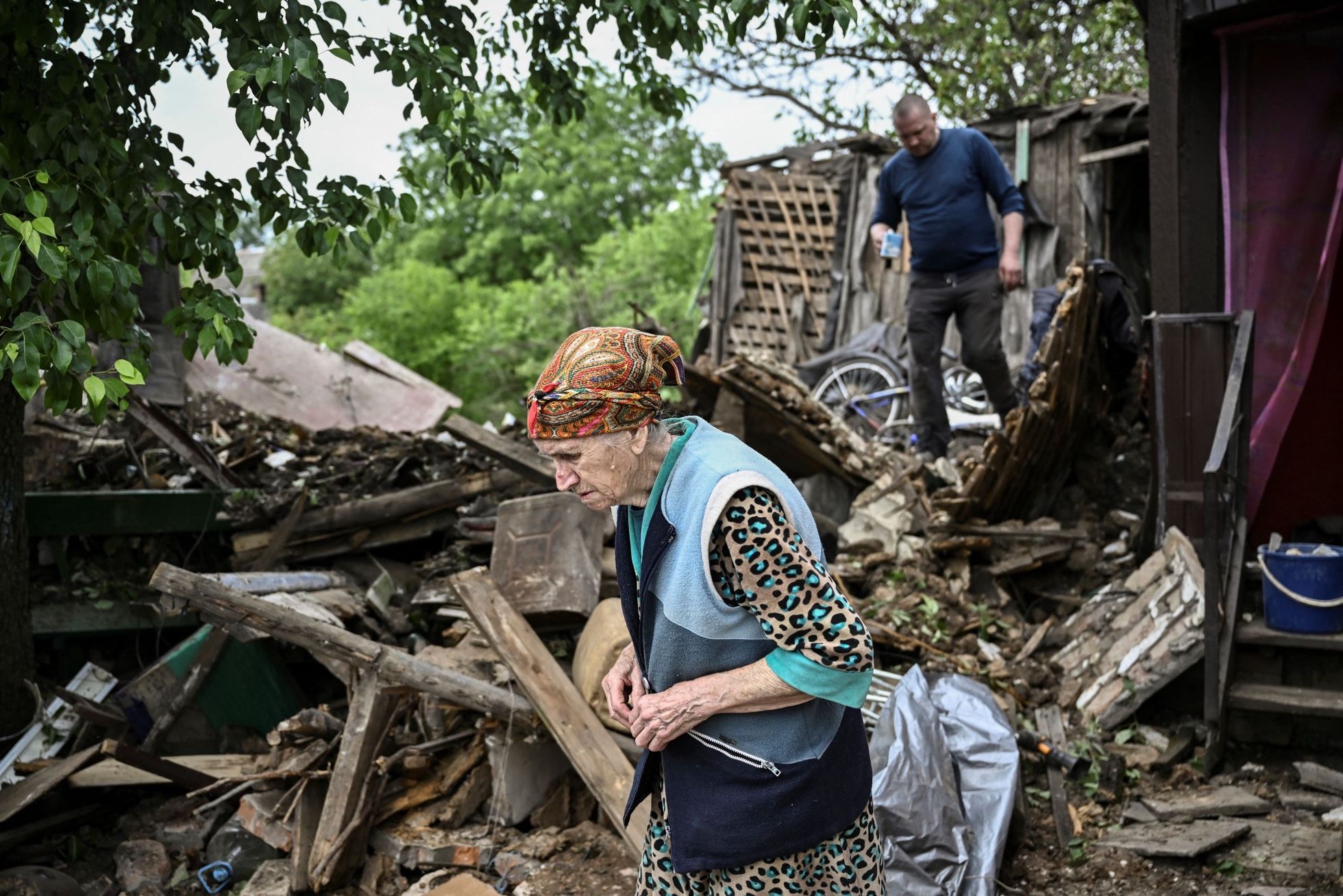 Женщина у своего дома, разрушенного после попадания снаряда. Город Бахмут Донецкой области Украины