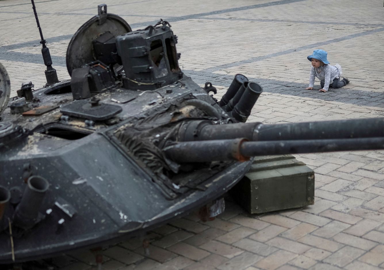 Gleb Garanich / Reuters / Scanpix / LETA Ребенок рассматривает башню взорванной бронемашины — она составляет часть экспозиции уничтоженной российской техники, которую устроили в центре Киева