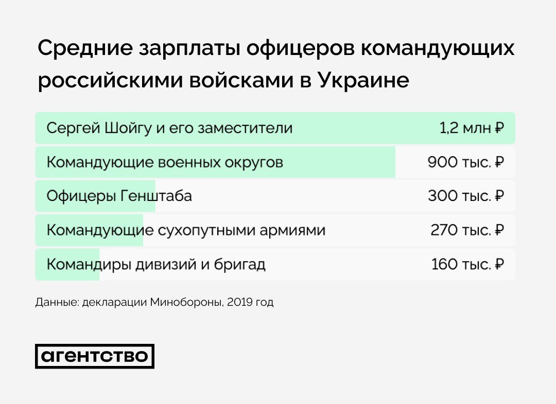 - Самое большое жалование получают те, кто сидят в кабинетах, — это чиновники Минобороны. Заместители министра обороны Сергея Шойгу зарабатывали в 2019 году в среднем 1,2 миллиона рублей в месяц. У командующих военных округов и отдельных родов войск жалованье чуть меньше — около 900 тысяч в месяц.