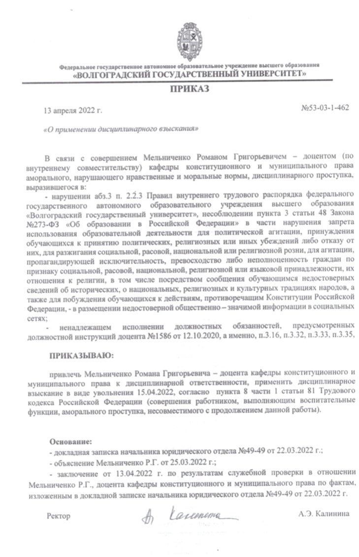 В первые дни войны 49-летний кандидат юридических наук, доцент и ведущий научный сотрудник Волгоградского государственного университета (ВолГУ) Роман Мельниченко разместил в соцсетях видео под названием «Разгром кадыровцев под Киевом». Мельниченко тяжело переживал ситуацию, так как его пожилые родители находятся в Украине. Он не мог поверить в то, что Россия напала на Украину. Спустя полторы недели Мельниченко позвонила заведующая кафедрой конституционного и муниципального права Марина Давыдова и сказала, что деканат попросил его удалить посты. «Я все удалил. Но поскольку я юрист, то знаю, что не писал ничего противоречащего законодательству», – рассказывает Роман Мельниченко.