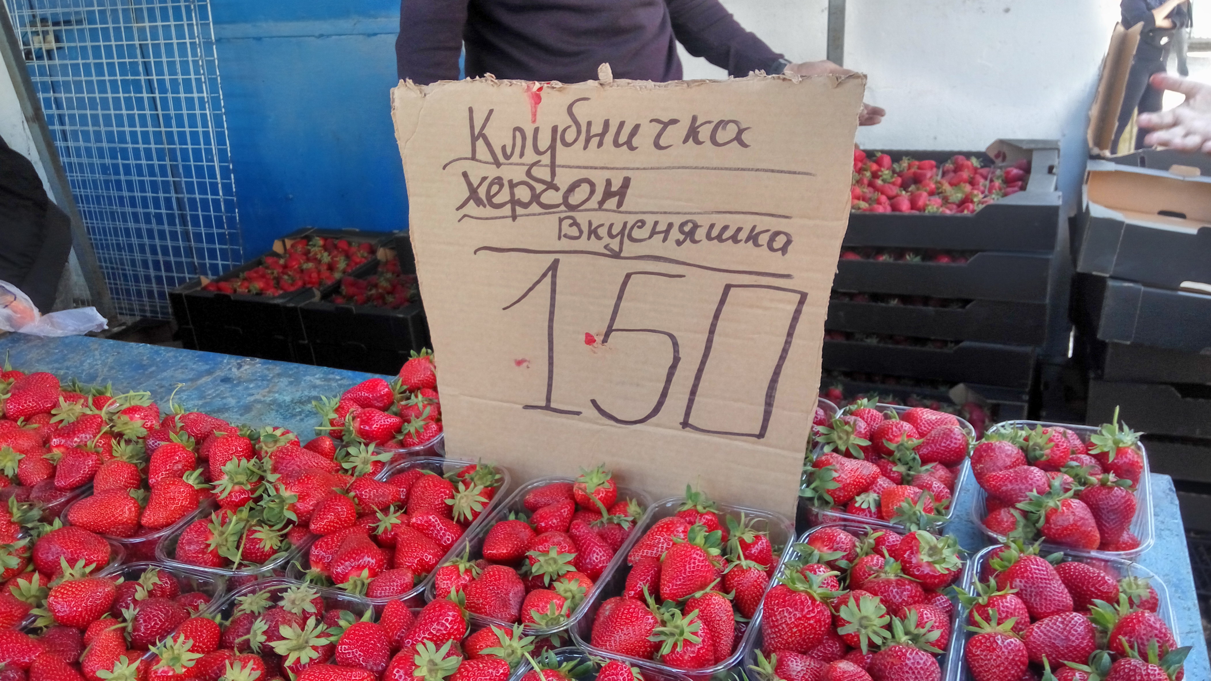 По этим данным, первыми продуктами, которые рекламировали как «херсонские», стали молодая картошка и огурцы. Цена – сравнима с обычной в Севастополе, 50-60 рублей за килограмм. С началом ягодного сезона в Севастополе начали продавать «херсонскую» клубнику по цене 150-200 рублей за килограмм. Это ниже средней рыночной стоимости. Клубнику привозят ежедневно, торговля происходит в постоянных точках.