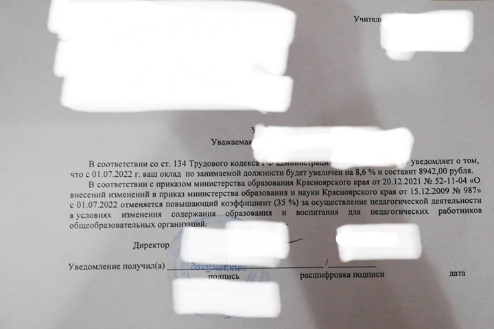 «С 1 июля 2022 года отменяется повышающий коэффициент (35%) за осуществление педагогической деятельности в условиях изменения содержания образования и воспитания для педагогических работников общеобразовательных организаций», — говорится в письме одному из преподавателей Красноярского края от директора его учебного заведения, копию которого опубликовал депутат заксобрания Александр Глисков.