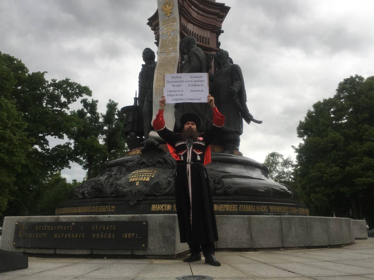 24 мая в центре Краснодара казак Григорий Русин провел одиночные пикеты в поддержку экс-майора МВД Алексея Дымовского и отбывающего административный арест, известного критика властей, блогера Асхаба Алибекова. В этот день в Краснодарском краевом суде начался пересмотр дела майора Дымовского, к которыми и была приурочена протестная акция. "Майор Дымовский и старший сержант Алибеков гордость и надежда народа на справедливость!" – говорилось на плакате Русина, вышедшего в антивоенный пикет в традиционной казачьей форме.
