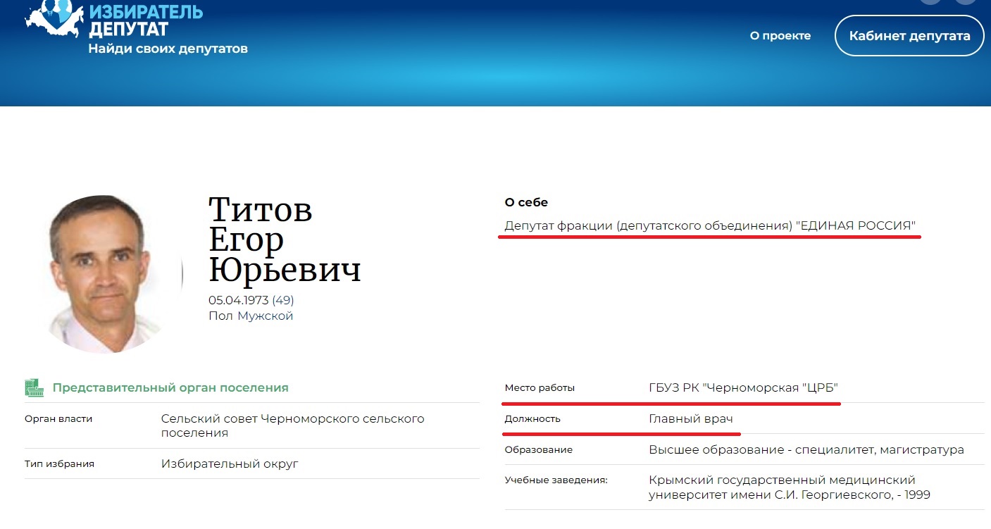 49-летний Егор Титов известен в Крыму не только как медик, но и политик – депутат сельского совета от российской партии власти «Единая Россия». Его анкету можно найти в российской базе депутатов.