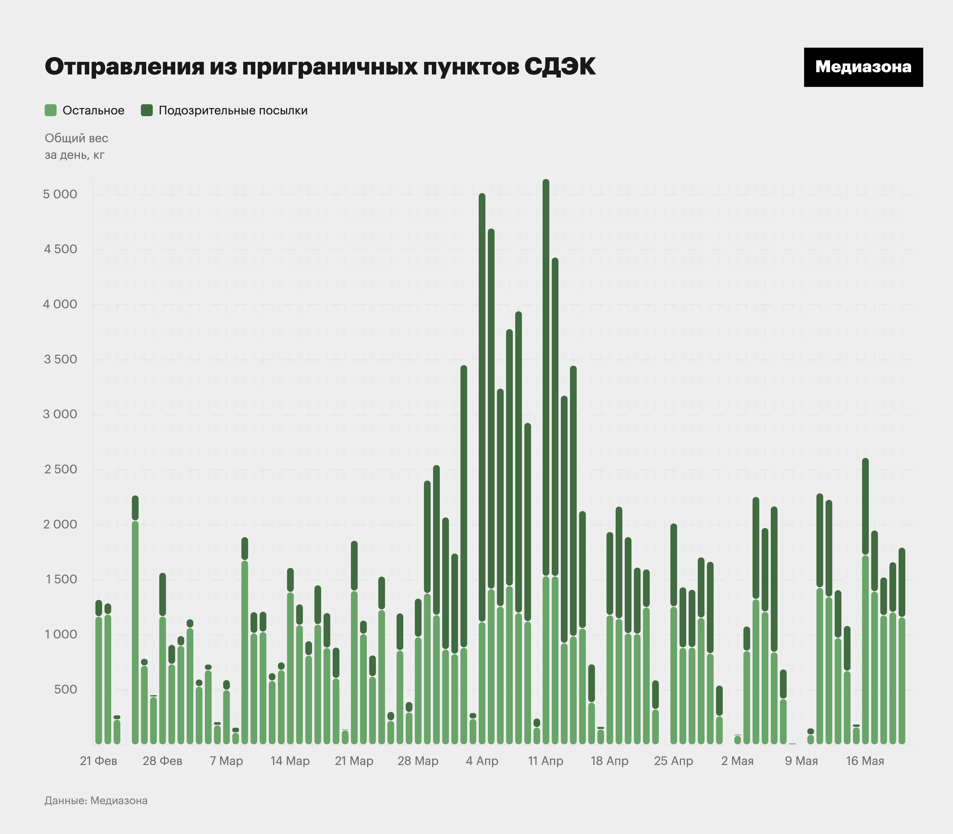 Пик такого рода посылок пришелся на 4 апреля — почти . После короткого спада ровно через неделю вес подозрительных заказов снова дорос до трех тонн, после чего началось снижение.
