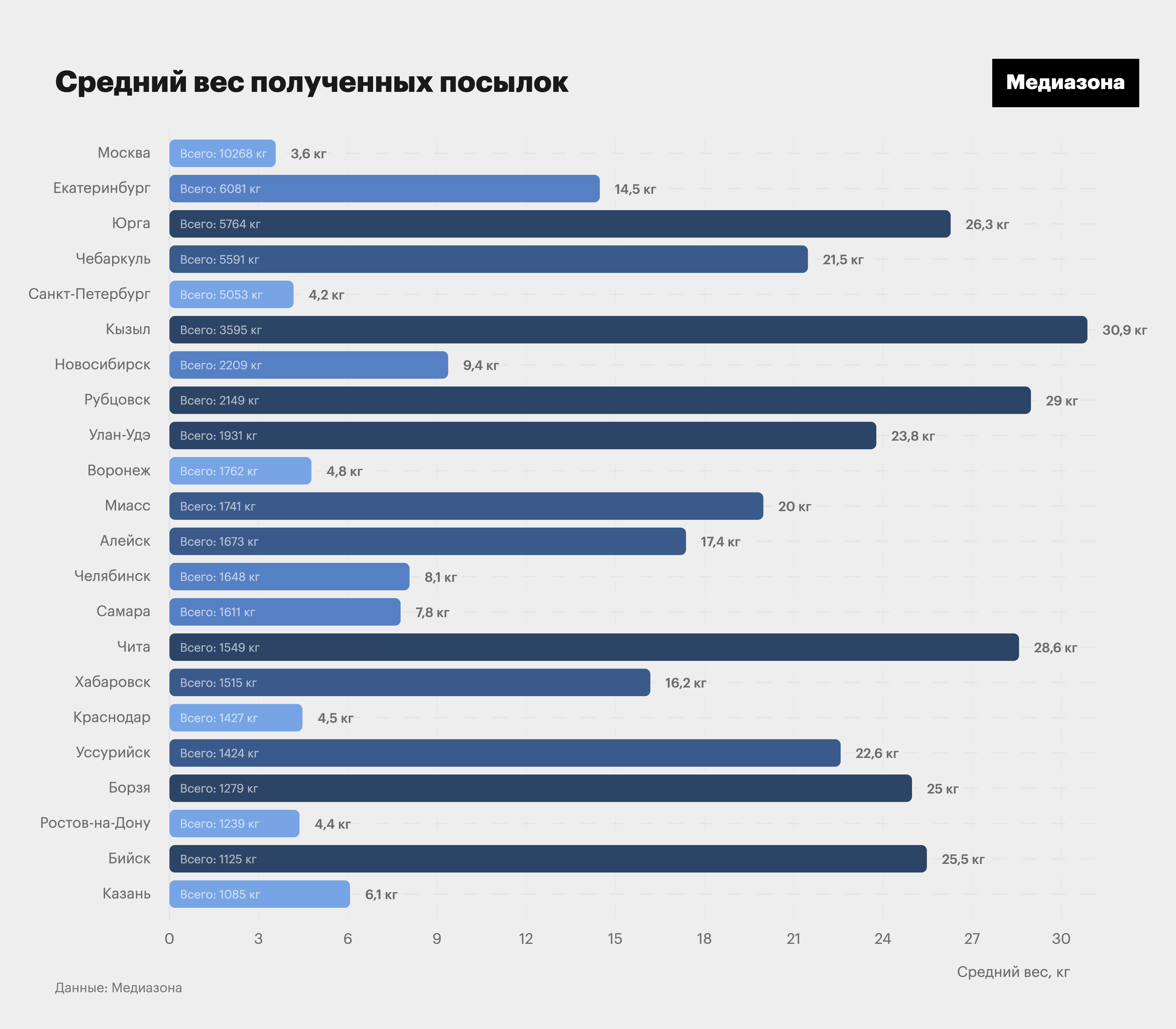 Наглядно отличить обычный пункт назначения от подозрительного можно по среднему весу посылки. На графике ниже приведены все города, которые с конца февраля получили из этих приграничных пунктов в общей сложности больше тонны посылок. Они отсортированы , и первое место занимает Москва. Но средний вес московской посылки небольшой, то есть в столицу отправляют много . Зато сразу же заметен нашумевший Рубцовск, который получил с границы больше двух тонн посылок. Их средний вес в восемь раз превосходит московский. Таким же образом выделяются Юрга, Чебаркуль, Миасс и другие города, получившие многие тонны посылок.