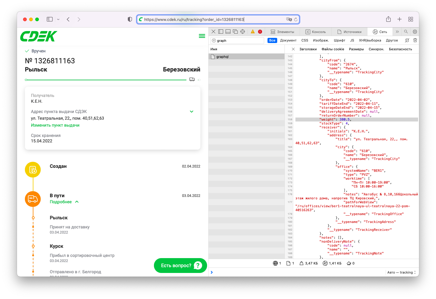 СДЭК позволяет клиентам отслеживать отправления, поэтому по номеру заказа сайт компании показывает подробный маршрут от пункта приема до пункта выдачи. Это обезличенная информация — никаких данных отправителя сервис не сообщает и выдает только инициалы получателя. Хотя вес посылки на сайте не отображается, его видно в коде страницы.