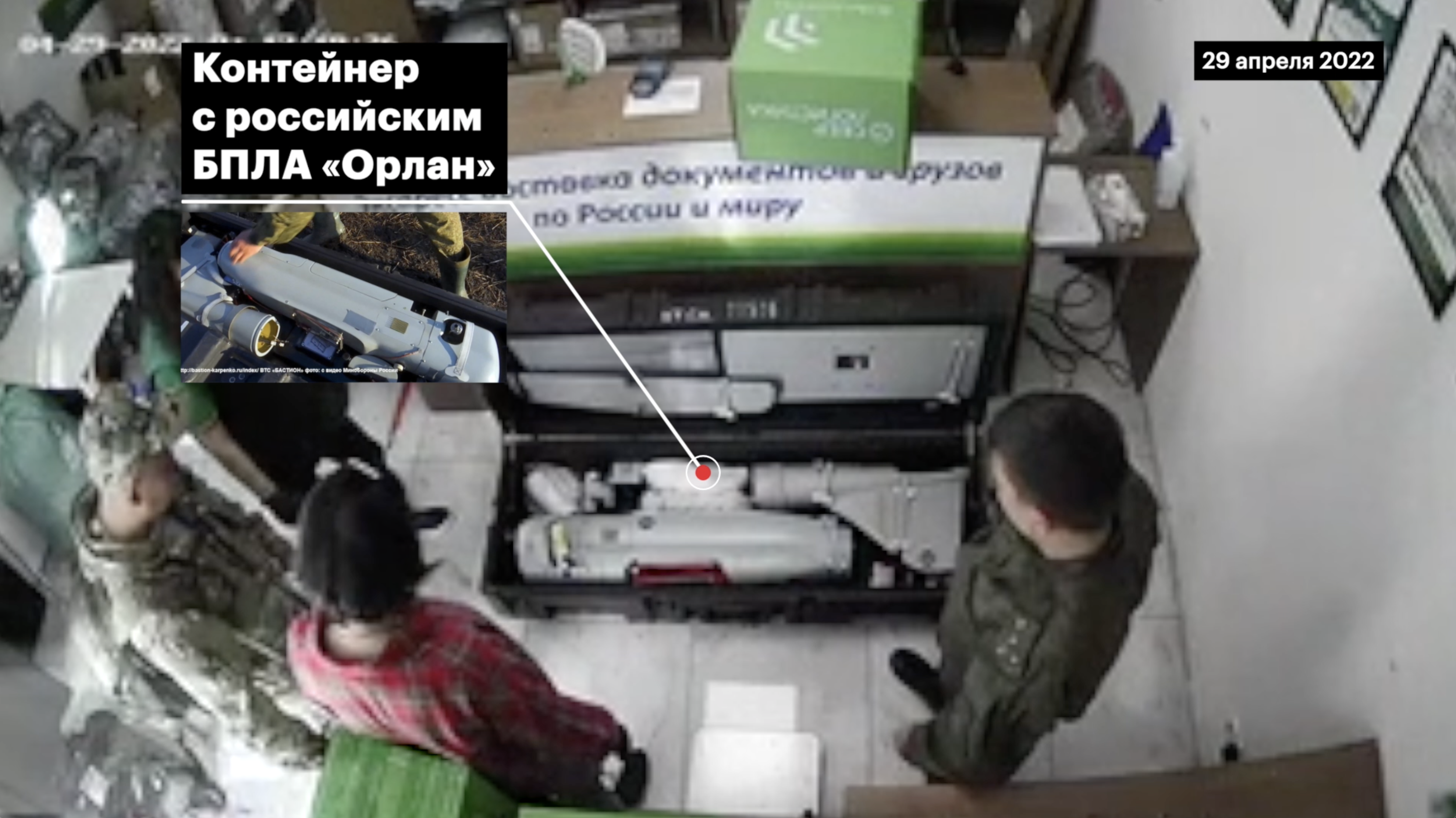 29 апреля в 17:18 в пункт СДЭК зашел офицер, судя по погонам, капитан. Он тянул за собой по полу тяжелый ящик. Две сотрудницы СДЭК вышли посмотреть, что на этот раз принесли люди в форме. Военный открыл контейнер: в нем лежал беспилотник, похожий на «Орлан».