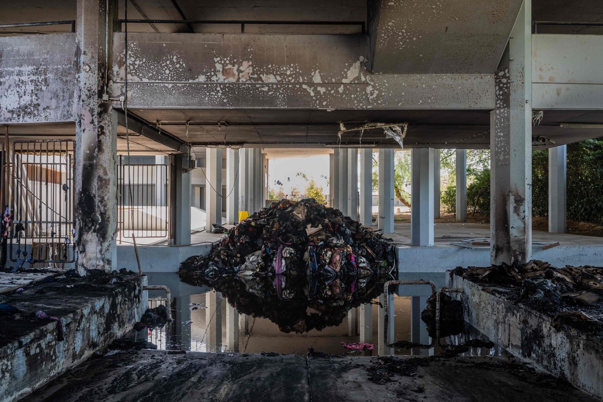 Постельное белье и одеяла, которые были собраны для отправки в Украину, но сгорели при пожаре в месте сбора — на стадионе в Афинах