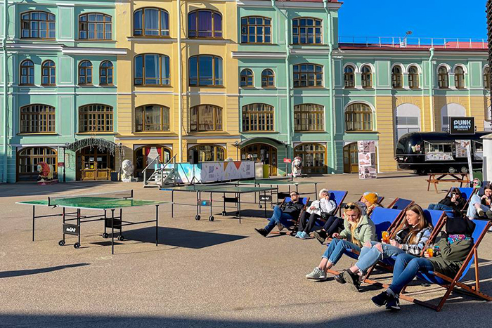 Во дворе установили столы и стулья, шезлонги, а также фудтраки с едой и напитками. Этим летом гастрономических резидентов стало больше: помимо пиццы гостям предлагают мексиканские тако и буррито, японский рамен, израильский хумус, бургеры и блюда из других стран.