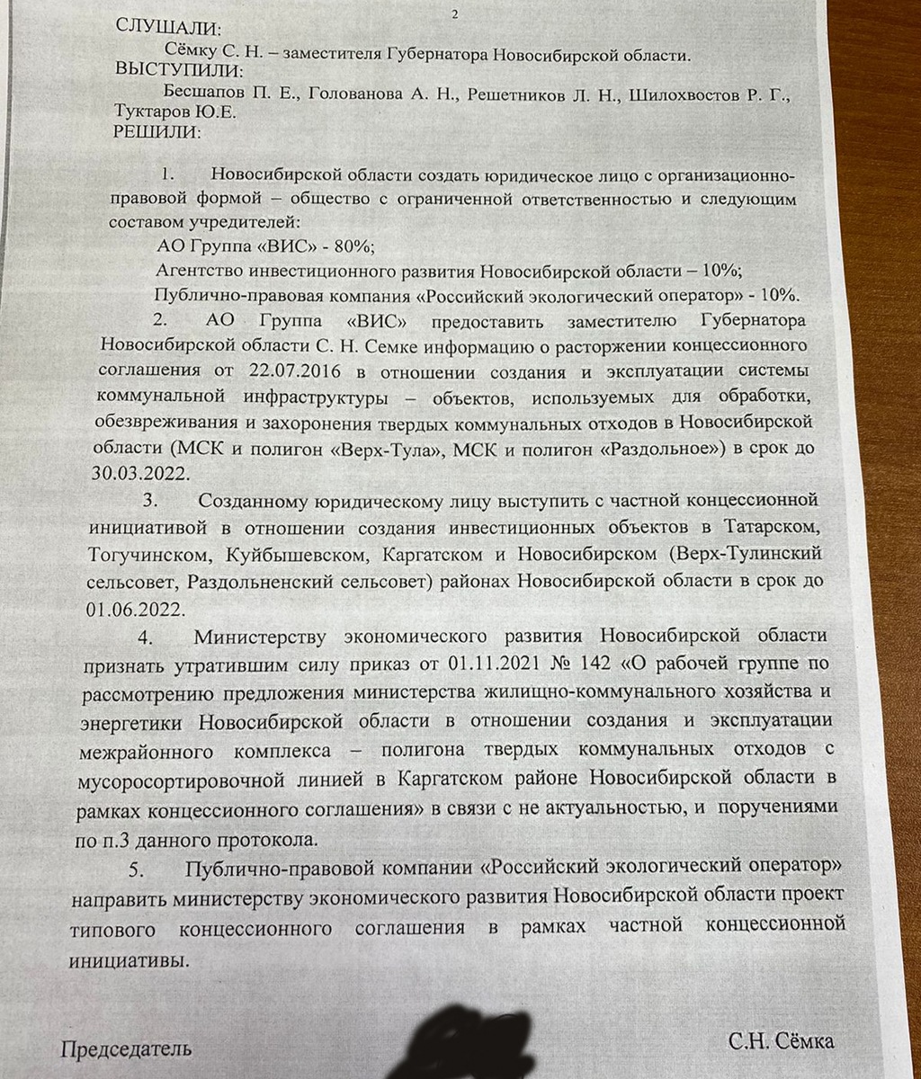 Копия «некоего» протокола того совещания имеется в распоряжении Тайги.инфо. Документ был подписан заместителем Травникова Сергеем Сёмкой. Из него следует, что представители облправительства договорились с «ВИС» создать компанию, в которой у «ВИС» было бы 80% доли, а у региональных властей и федерального «Российского экологического оператора» — по 10%.