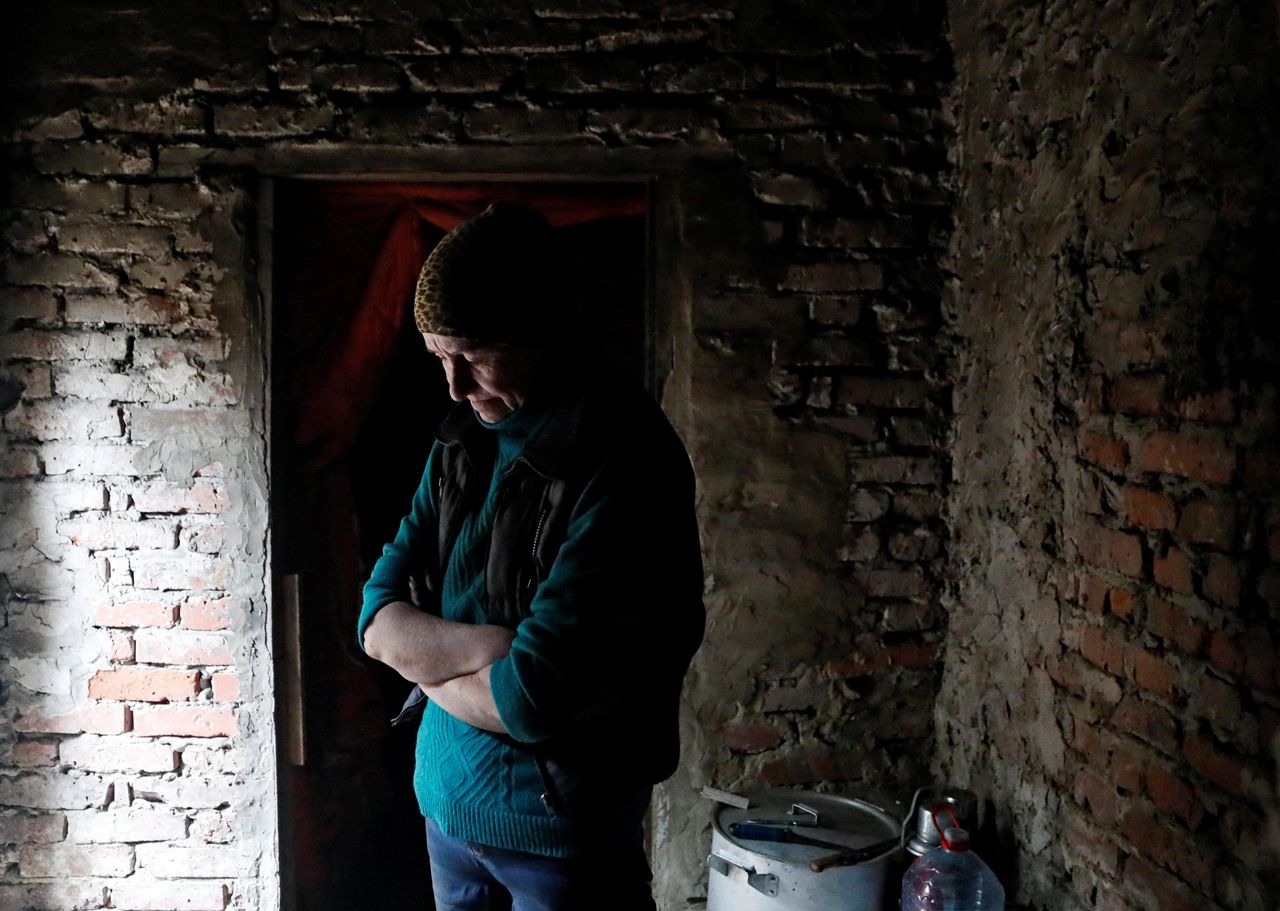 Житель села Маяки Донецкой области открывает дверь бомбоубежища