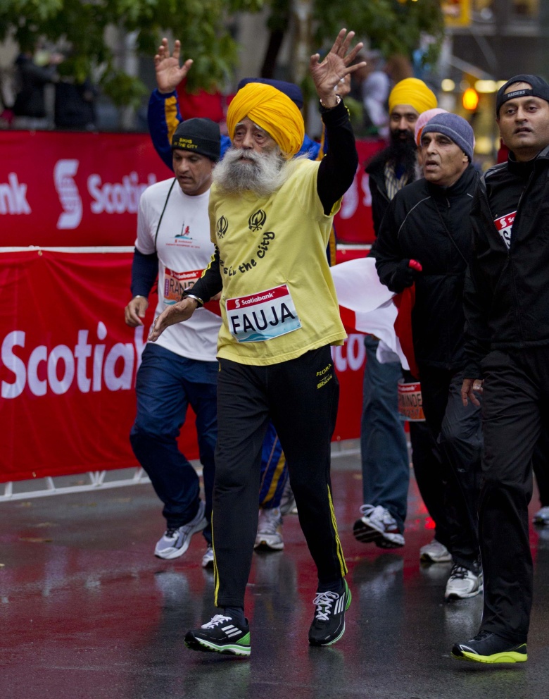 101-летний марафонец Фауджа Сингх на 23-м Toronto Waterfront Marathon в Торонто, 14 октября 2012 года