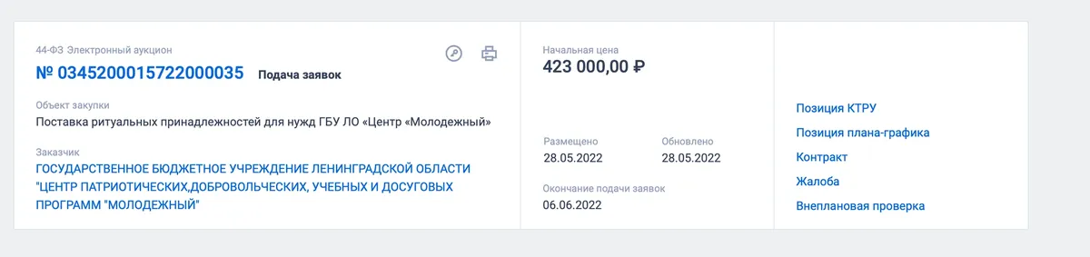 Заявка размещена 28 мая. Начальная цена контракта составляет 423 тысячи рублей. В качестве источника финансирования указаны «средства бюджетных учреждений».