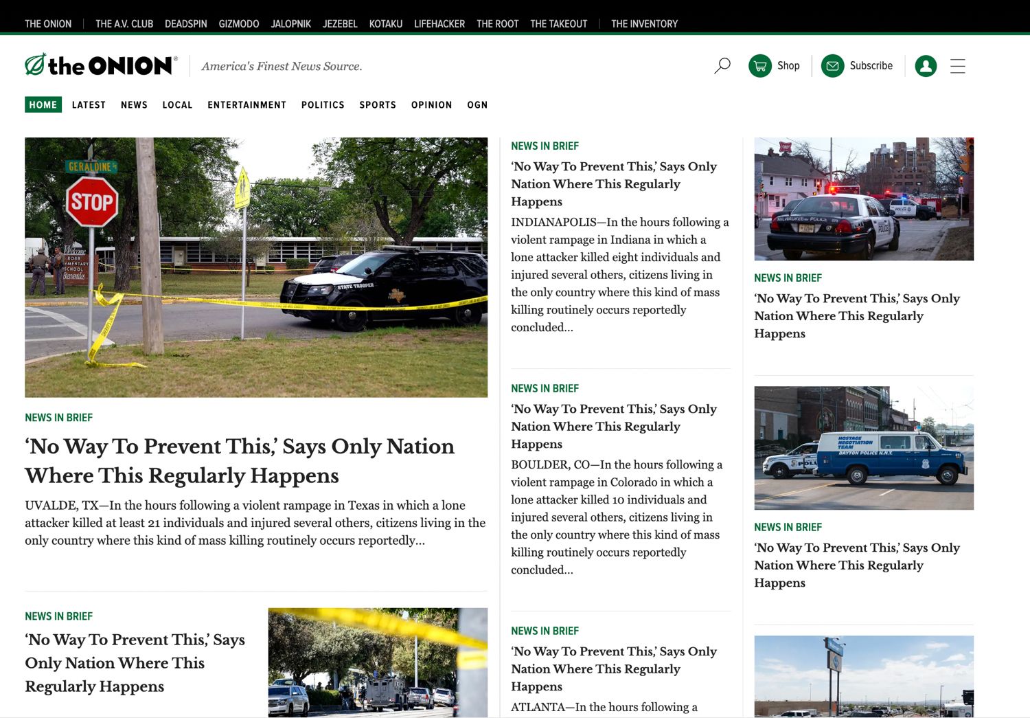 Самым сильным высказыванием об этой безвыходной ситуации раз за разом оказывается заметка сатирического сайта The Onion с заголовком «„С этим ничего нельзя поделать“, — говорит единственная нация, у которой это регулярно происходит». С 2014 года, когда этот текст вышел впервые, его дословно, изменяя только количество жертв очередного шутинга и другие мелкие подробности, сайт перепечатал уже 21 раз. 25 мая 2022 года The Onion выложил все эти заметки на главную страницу сайта одновременно.