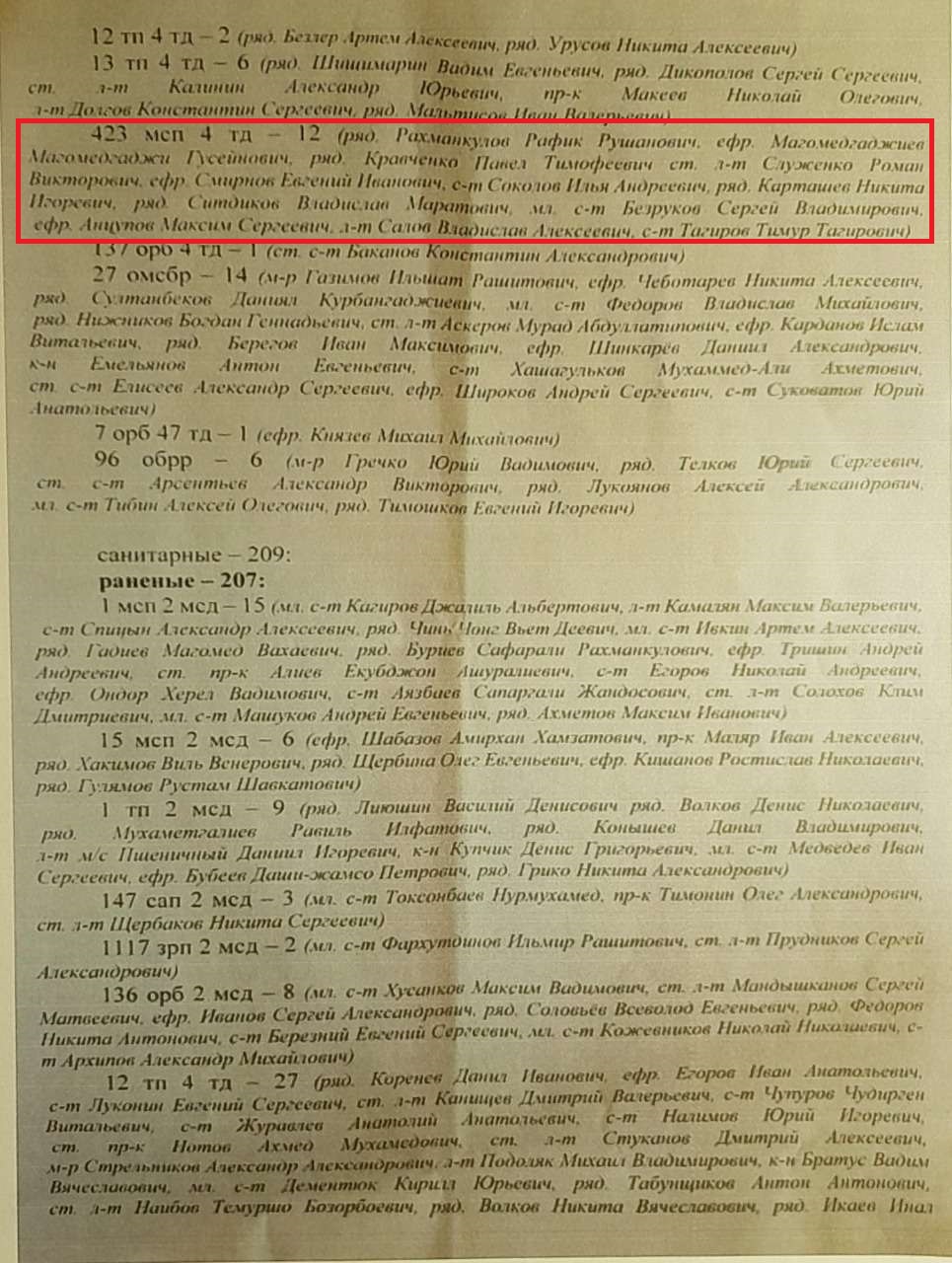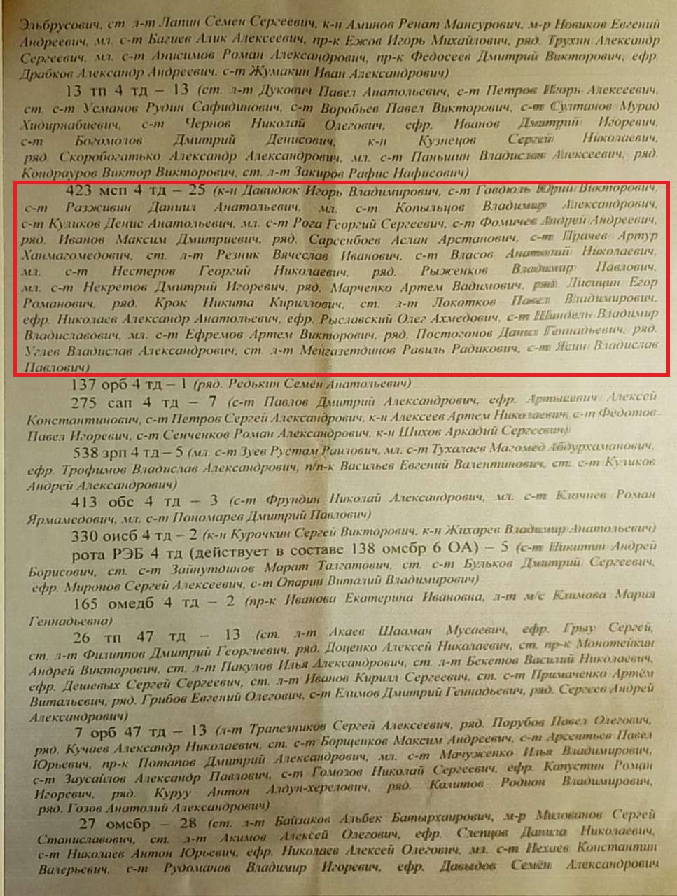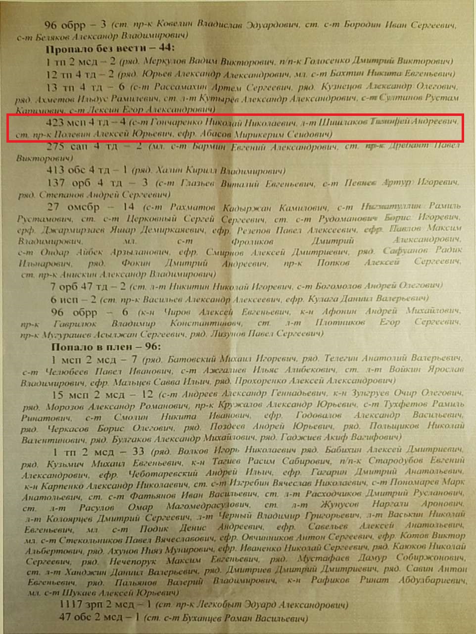 Позже стало известно и о других убитых военнослужащих 423-го полка. Это старший лейтенант Сергей Аргентов, погибший 22 марта под г. Тростянец Сумской области, и ефрейтор Вадим Орлов, который погиб 2-го мая.