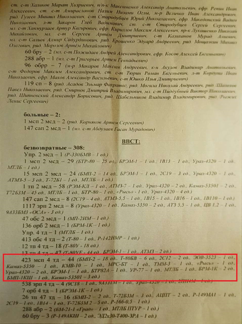 Из документа также следует, что соединение потеряло 44 единицы военной техники: 18 БМП-2, 6 танков Т-80БВ, 2 миномётных комплекса 2С12 “Сани”, 1 экскаватор ЭОВ-3523, 1 КамАЗ-5350, 1 кран-манипулятор КМВ-10, 1 ремонтно-слесарную мастерскую МРС-БТ, 1 тяжёлый механизированный мост ТММ-3, 1 бронеавтомобиль «Рысь», 2 Урал-4320, 1 бронированную ремонтно-эвакуационную машину БРЭМ-1, 1 БТР-82А, 1 самоходную реактивную установку разминирования УР-77 «Метеорит», 1 бронетранспортёр МТЛБ, 2 боевых разведывательных машины БРМ-1К, 1 БМП-1КШ, 3 КамАЗ-53501.