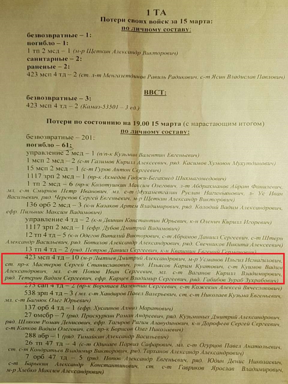 Позднее, 16 мая, Главное управление разведки (ГУР) Минобороны Украины опубликовало документ, составленный в 1-й танковой армии Вооруженных сил России. Его подлинность подтверждает исследование журналистов «Медиазоны», которым удалось проверить эту информацию по другим источникам.