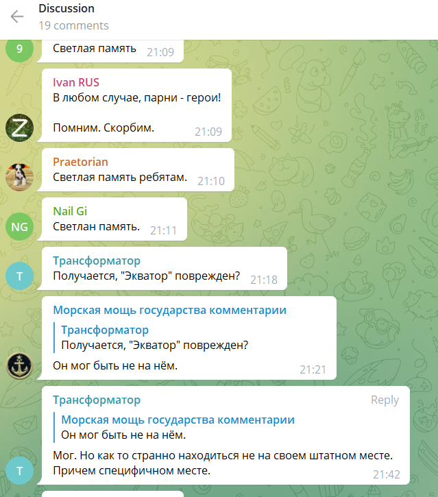 В соцсетях и СМИ также обсуждалась судьба разведывательного корабля «Экватор» – из-за похорон старшего моториста боевой части корабля Мурата Хатажукова и радиотелеграфиста оттуда же Дмитрия Деева. Вопросы о корабле возникли не только у украинских пользователей соцсетей, но и у российских.