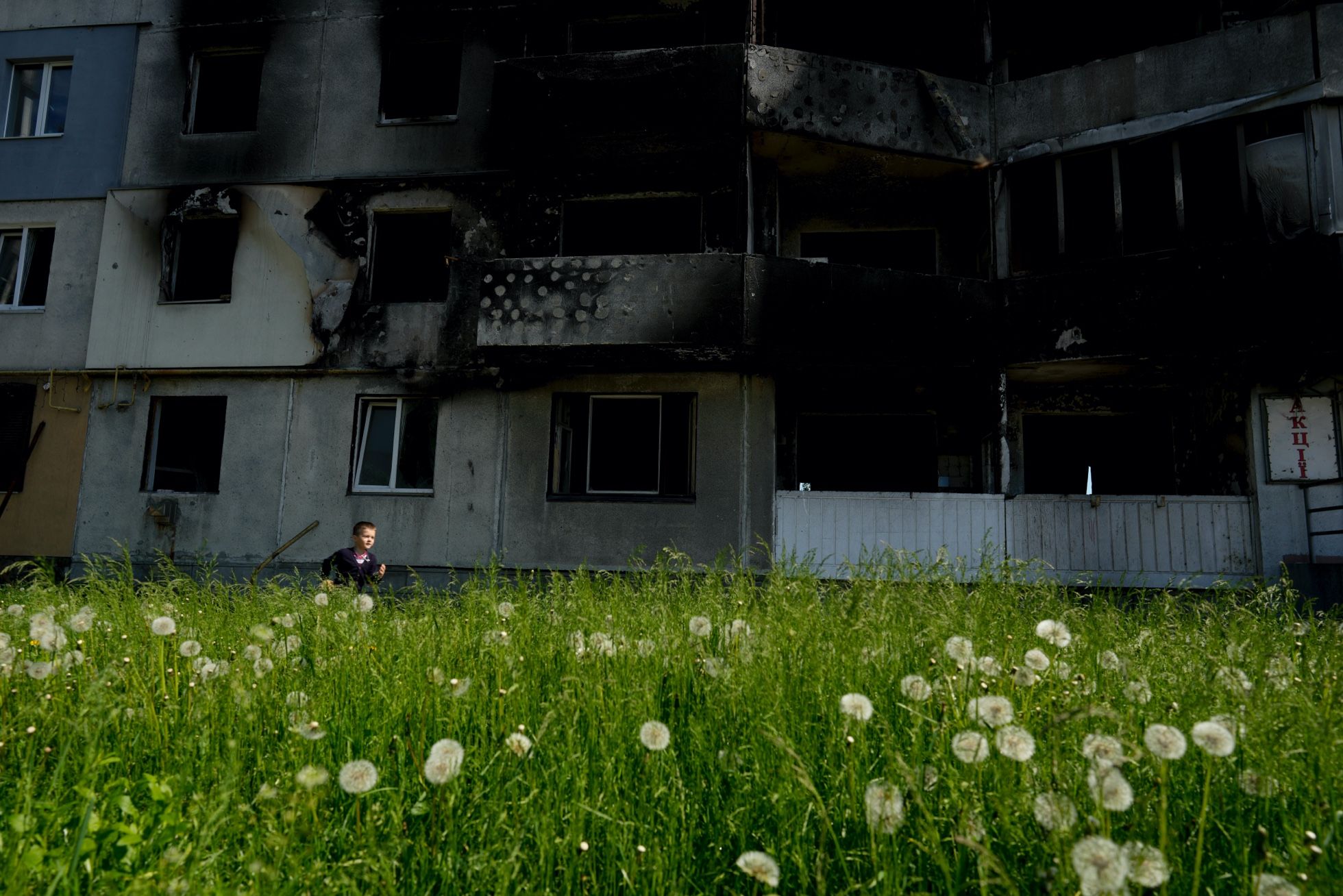 Бородянка. Мальчик бежит вдоль разрушенного дома