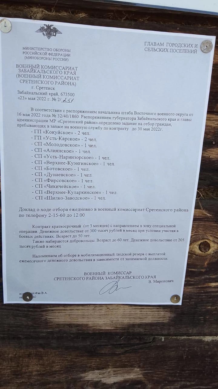 В городе Сретенск Забайкальского края на публичном стенде появилась копия документа от местного военкомата с заданием от Минобороны России набрать солдат. В списке указаны города и села Сретенского района и количество военных, которых должны оттуда отправить на войну в Украину. Фото документа местное издание Чита.Ру получило от очевидца - его подлинность подтвердили в военном комиссариате края.