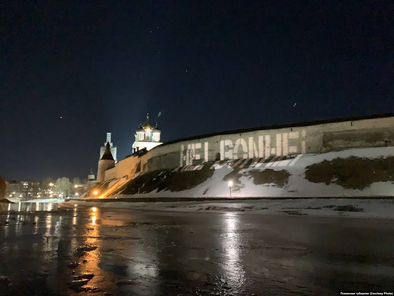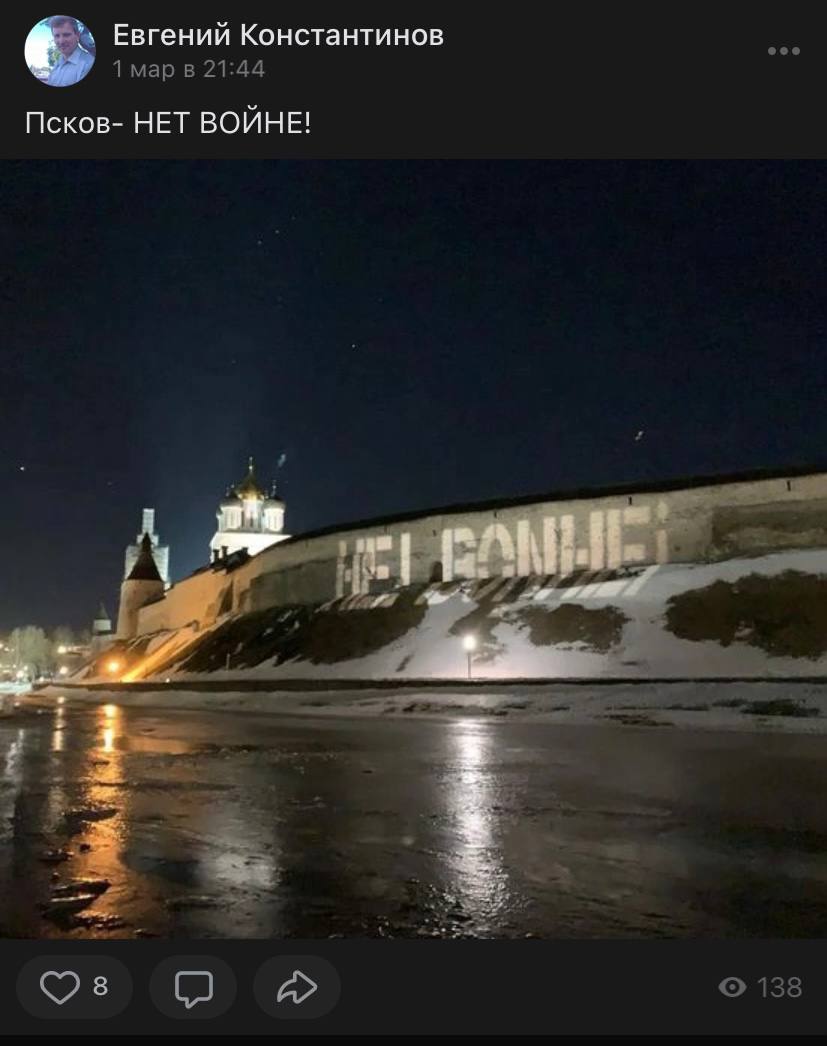 Тогда неизвестные активисты сделали проекцию на стены Псковского кремля световой надписи "Нет войне". Она продержалась совсем недолго, организаторов флешмоба полиция не нашла, а сфотографировать инсталляцию успели только журналисты "Псковской губернии". Фотографии они выложили в соцсетях. Одну из них и перепостил Константинов.