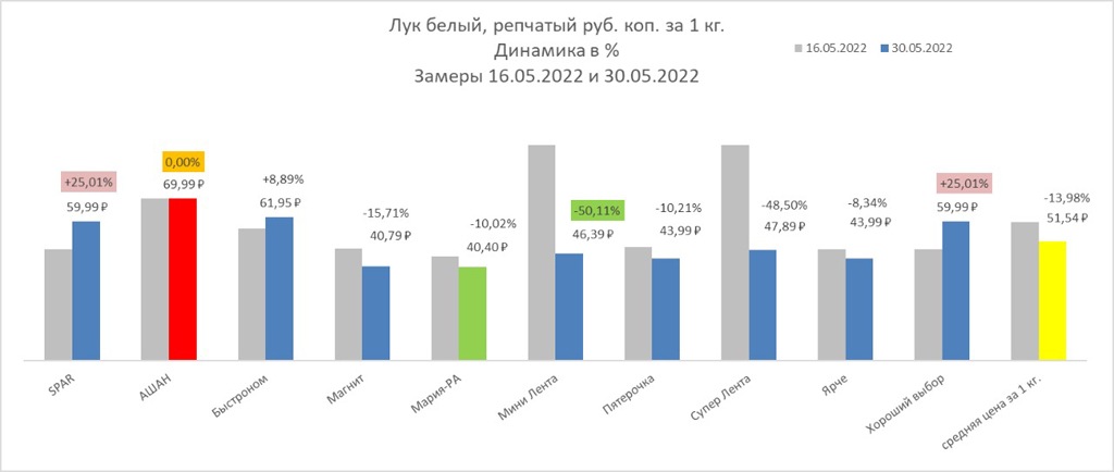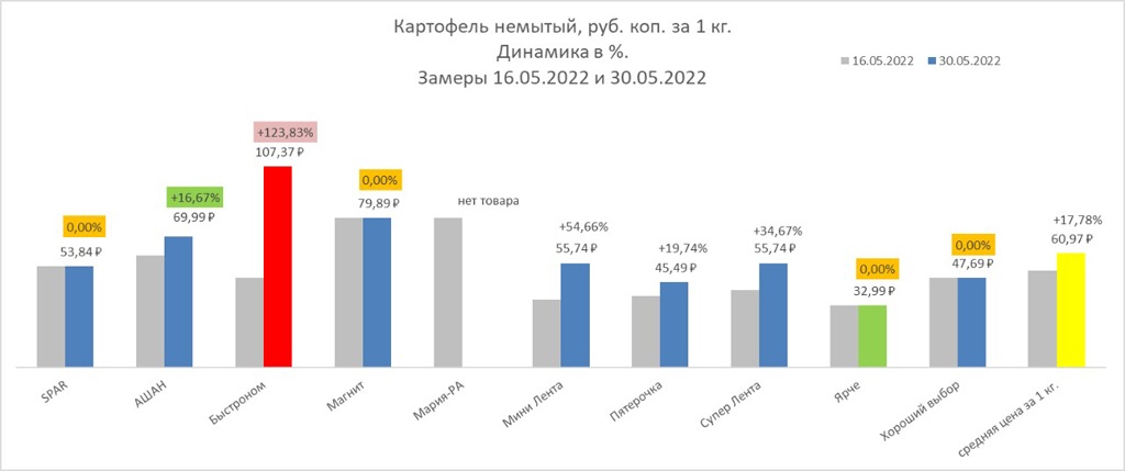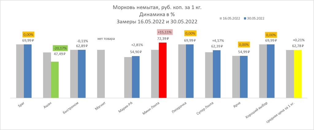 Цены фиксируют в сетях Spar, «Ашан», «Быстроном», «Магнит», «Мария-Ра», «Мини Лента», «Пятерочка», «Супер Лента», «Ярче» и «Хороший выбор». Принцип выбора товара — самая низкая стоимость. Сравнивать будем цены за 16 мая и 30 мая.