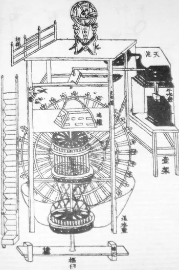 В конце XI века изобретатель и эрудит Су Сун построил башню с водными астрономическими часами и механическими фигурками. Манекены, облаченные в китайские одеяния, выходили из миниатюрных открывающихся дверей, чтобы объявлять время дня, указанное на специальных табличках. Фигурки звонили в колокола и били в гонги. Для работы сложного механизма использовались косые шестерни и спусковой механизм, внешний фасад башни выглядел как причудливая китайская пагода. Башня была высотой около 12 метров и шириной около 7 метров, принцип ее действия Су Сун описал в позднее утраченных трактатах. Миниатюрная модель часов китайского инженера была реконструирована Джоном Кембриджем и теперь выставлена в Музее науки в Лондоне. В Китайском историческом музее в Пекине башню с часами также реконструировали в 1950-е годы, но она была в пять раз меньше, чем описано в трактате Су Суна.