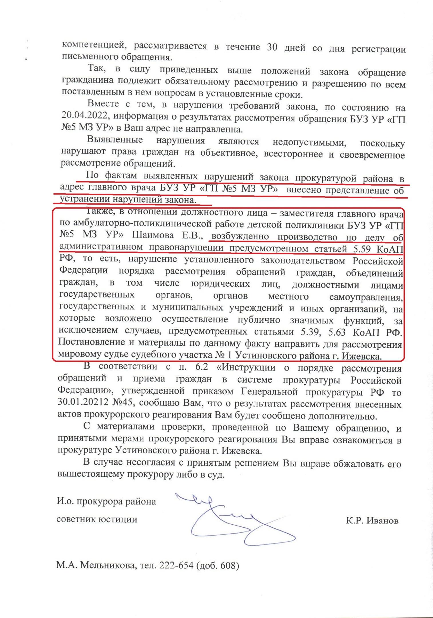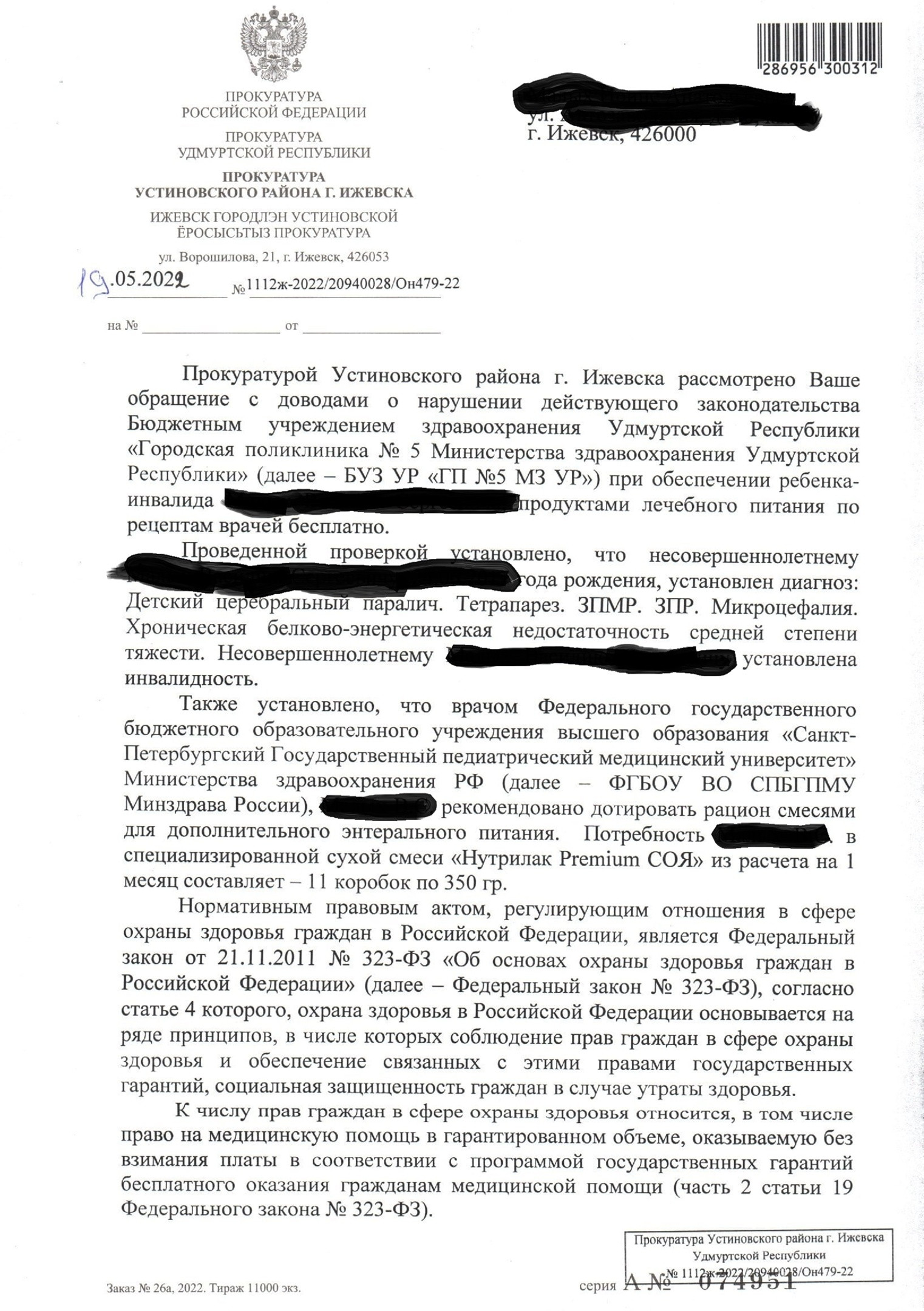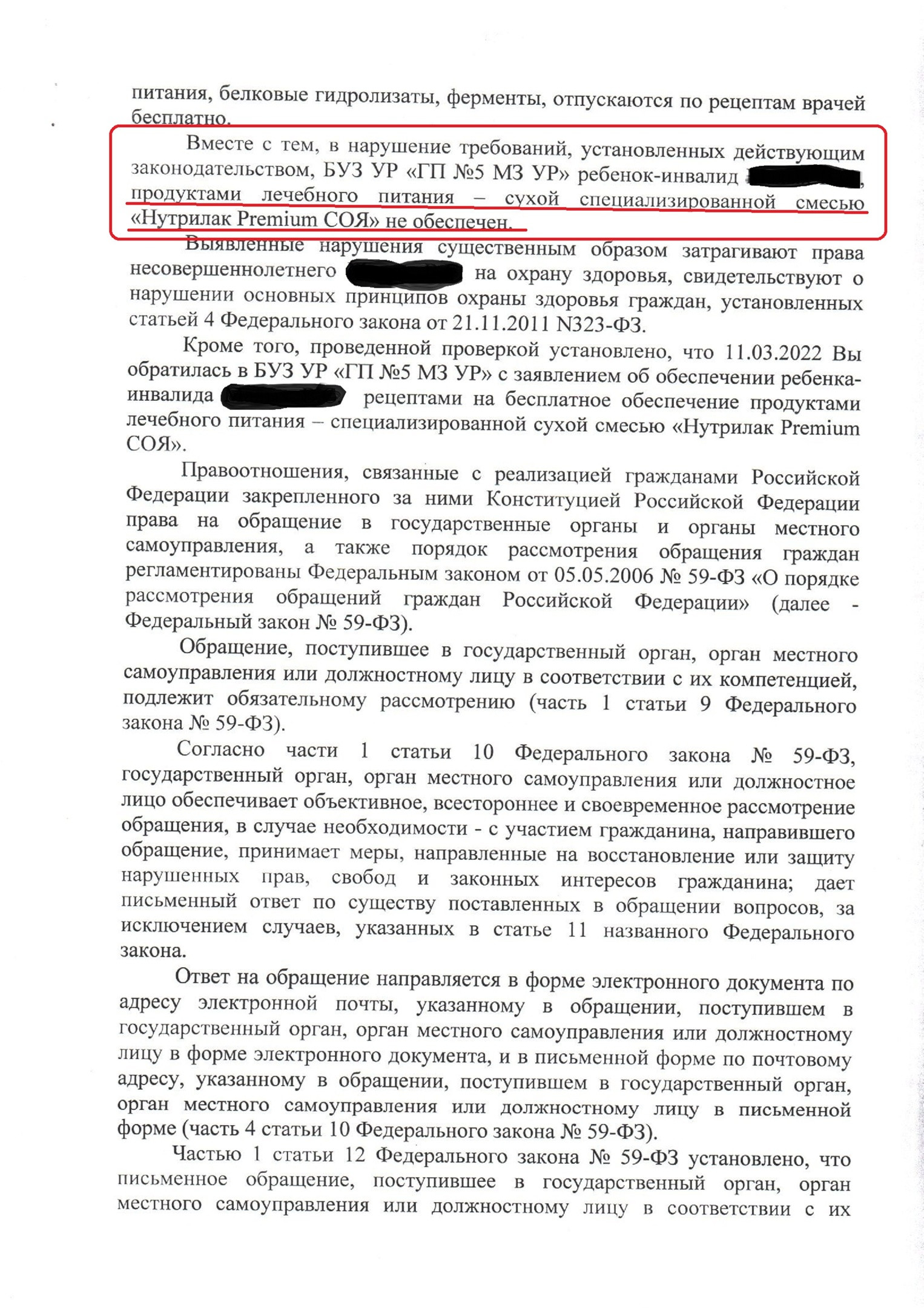 Мягко говоря, ответ просто не был предоставлен маме "особенного" ребенка. Получается, мало того, что не выписывают рецепт, так еще и не предоставляют ответа. Почему-то странно, что прокуратура Удмуртии не выявила аналогичный факт в действиях Минздрава, ответ которого законный представитель также не получил (по этому поводу еще придется отдельно разбираться).