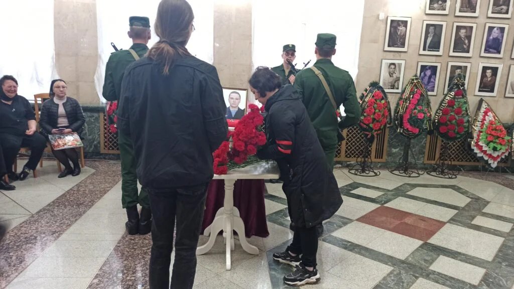 В стороне стоит группа молодых людей в траурной одежде — это одноклассники и друзья Дмитрия. Кажется, будто они растеряны — никто не перешёптывается, все молча смотрят на гроб, обитый красной тканью. Он накрыт двумя флагами: российским триколором и башкирским, сине-бело-зелёным.