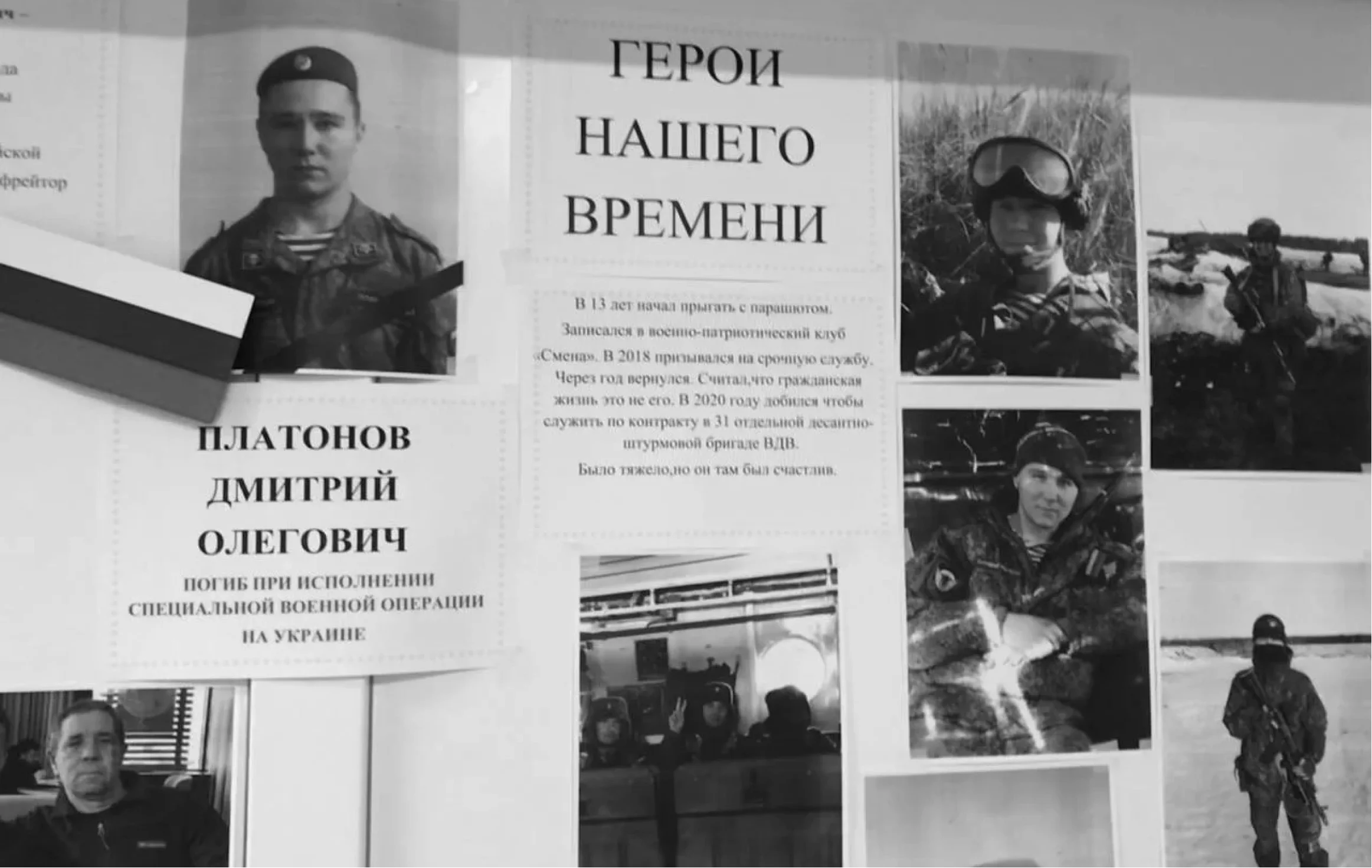 В самом городе о погибшем солдате ещё некоторое время будет напоминать мемориальный стенд в школе № 130 — там Платонов учился до 9‑го класса. На стенде висят фотографии Дмитрия и небольшой листок бумаги с рассказом о бывшем ученике. В нём про Дмитрия написано: «Считал, что гражданская жизнь не для него».