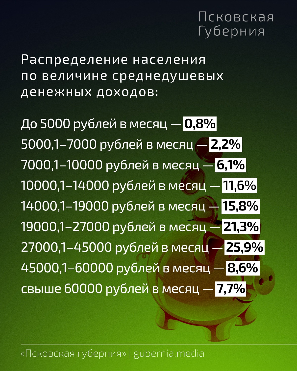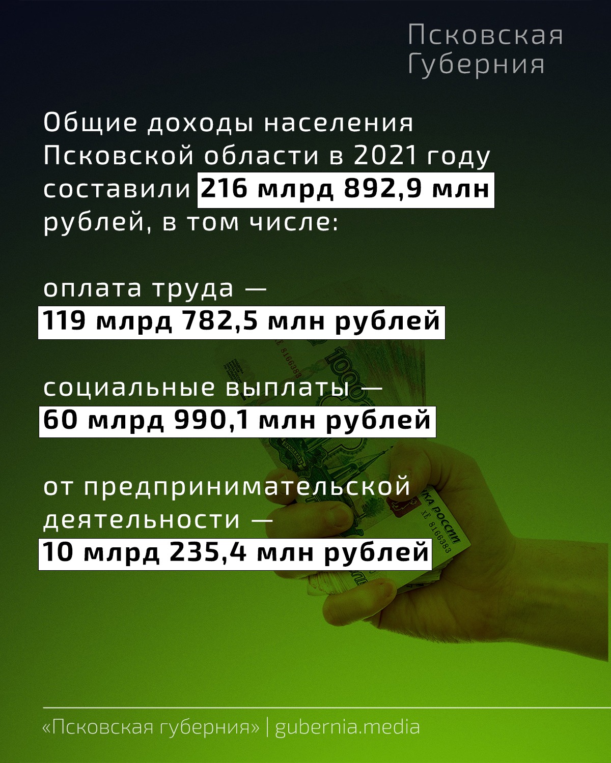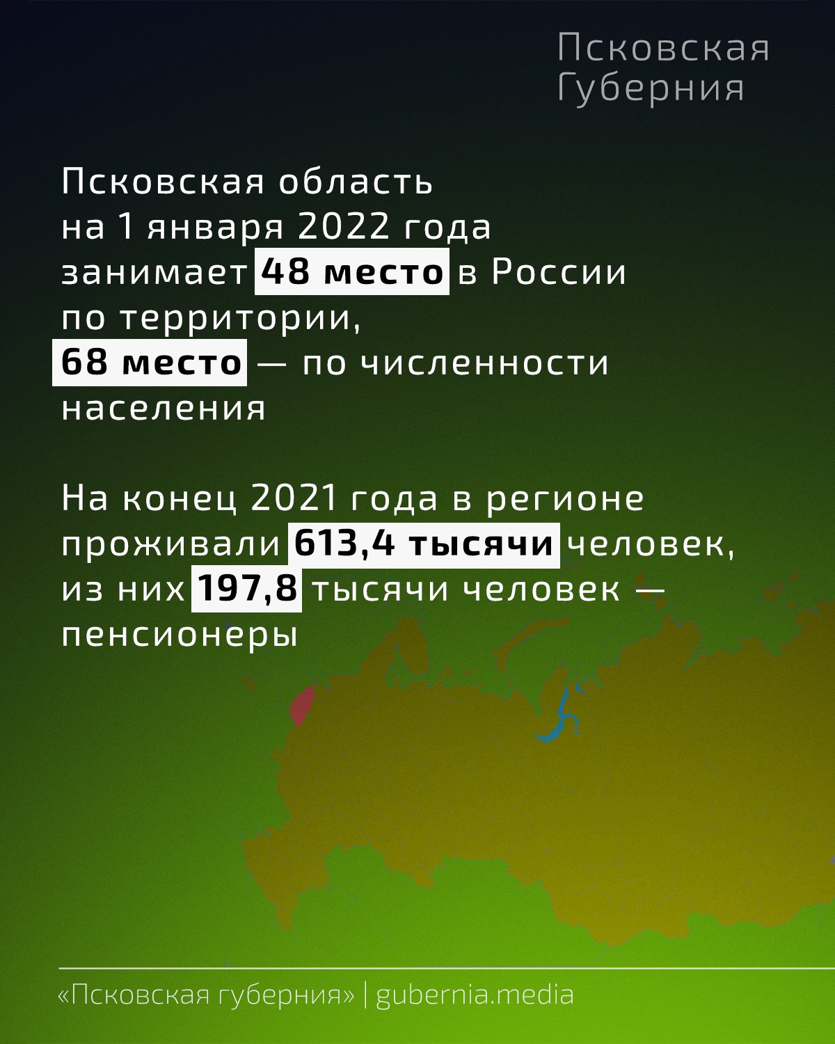 Псковстат выпустил краткий статистический сборник «Псковская область в цифрах» за 2021 год. «Псковская губерния» собрала в карточки некоторые из них: