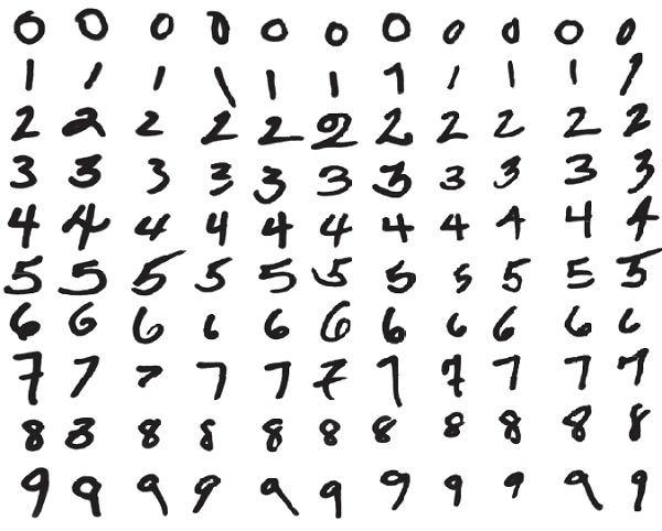 Как компьютер это делает? Мы уже почти всё объяснили в примере с кошками и собаками. Сначала мы собираем обучающий набор. Нам нужна большая коллекция цифр, написанных от руки, — тысячи изображений, — которые люди пометили как 0, 1, 2... 9. В основном предел способности компьютера обучиться зависит от доступности качественных меток, на которых можно тренировать машину. К счастью для почтовой системы, еще много лет назад была создана огромная база помеченных цифр, написанных вручную. Это Усовершенствованная база Национального института стандартов и технологий (MNIST), в которую входит 70 тысяч размеченных изображений цифр, сходных с теми, что показаны ниже.