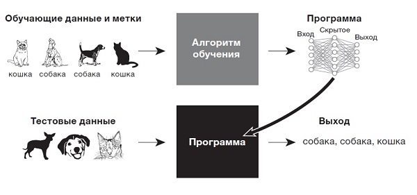 В машинном обучении вы предоставляете компьютеру обучающий набор данных. Если вам нужно, чтобы он различал изображения собак и кошек, значит, вы дадите ему именно их, а также метки для обучающего набора, которые вы считаете корректными. В примере с кошками и собаками мы скажем компьютеру, что изображено на каждом рисунке из набора — кошка или собака. Затем компьютер использует обучающий алгоритм, чтобы создать новую программу.