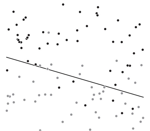 Чтобы избежать переобучения, попытаемся использовать более простую модель. Давайте возьмем в качестве границы прямую линию. Хотя прямая может быть слишком простой для большинства наборов данных, здесь она проиллюстрирует нашу идею. Эта менее сложная модель несовершенна — не существует прямой линии, которая бы идеально отделяла светлые точки от темных, — но мы можем найти прямую линию, которая будет ошибаться только в случае с семью темными и десятью светлыми точками.